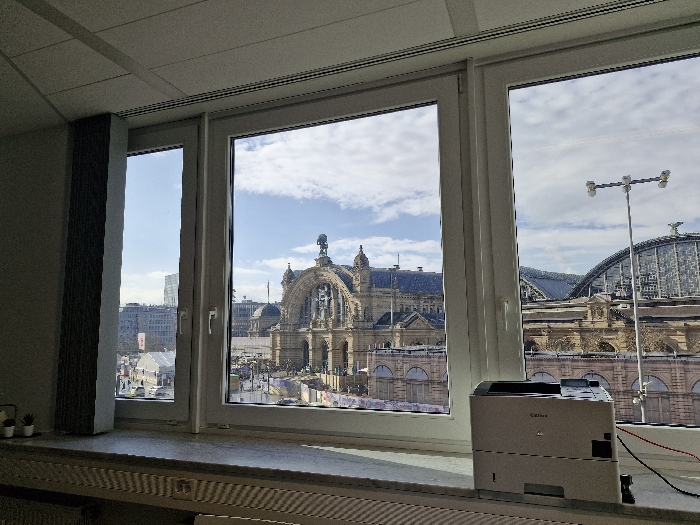 - "The image depicts an interior view looking out through a multi-pane window onto the city of Frankfurt, Germany, with the Frankfurt (Main) Hauptbahnhof (central train station) prominently in the background" by FM-WNeXD3, licensed under CC BY 4.0