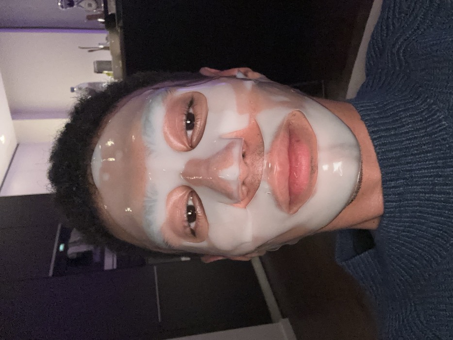 An individual with medium-dark skin and short, dark, curly hair is depicted in a close-up, chest-up indoor portrait. They are wearing a translucent facial sheet mask that covers the majority of their face, revealing parts of the skin around the eyes, nostrils, and a portion of the mouth. The mask itself shows areas of white and light blue application. The person is looking directly forward into the camera lens. They are dressed in a dark blue, ribbed knit sweater. The background is dimly lit and consists of an interior space, likely a modern private residence located in London, United Kingdom. To the viewer's left, dark cabinetry or a wall is visible, with a faint reflection suggesting a kitchen appliance. To the viewer's right, a counter or shelf holds a blue plastic water bottle, several dark cylindrical objects, and a metallic or glass object. No specific street or district within London is discernible from the visual evidence.