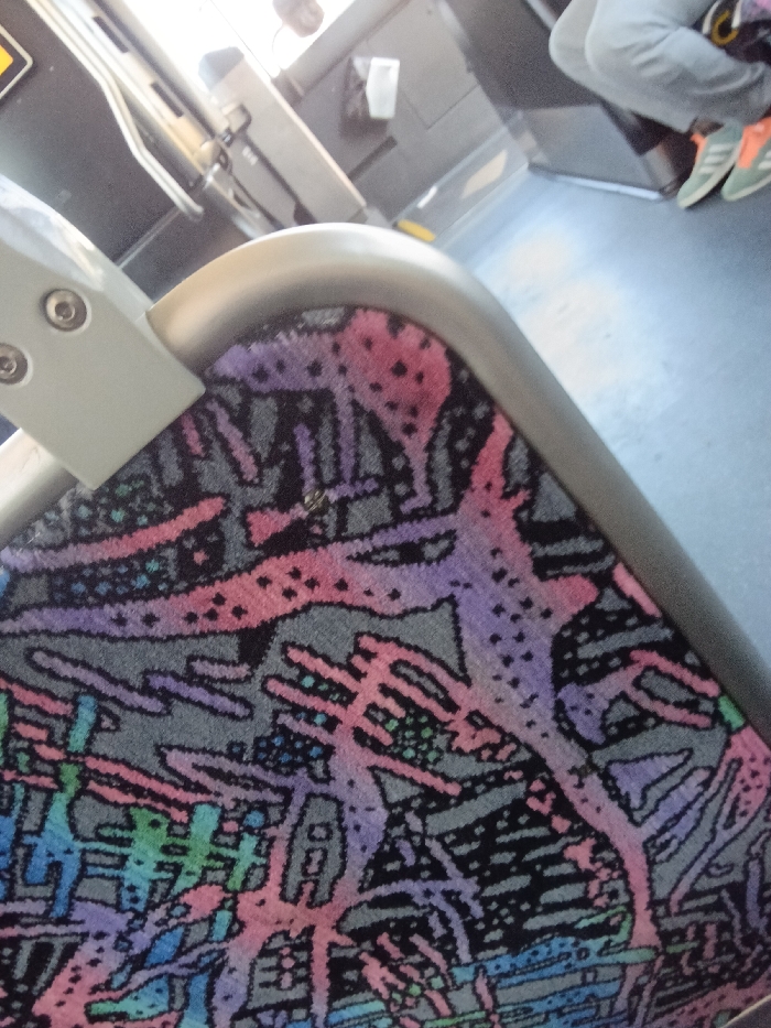 The image depicts the interior of a public transit vehicle, located in the city of Monterey Park, United States of America. The primary subject in the foreground is the upholstery of a seat, featuring an abstract, multicolored pattern on a grey background. The pattern includes elements in pink, purple, blue, green, and black. A light grey, curved plastic or metal frame, secured by two visible silver fasteners, borders the top-left edge of the seat. A small, dark speck is present on the patterned fabric. In the blurred background, the lower half of a person is visible, seated across an aisle or in a seat behind the perspective. This individual wears light-colored trousers and white athletic shoes with distinct orange-pink accents and light green stripes. The vehicle's floor is light-colored. Additional elements of the vehicle's interior, including vertical support poles and indistinct panels, are discernible in the distance. The environment is illuminated by ambient light.