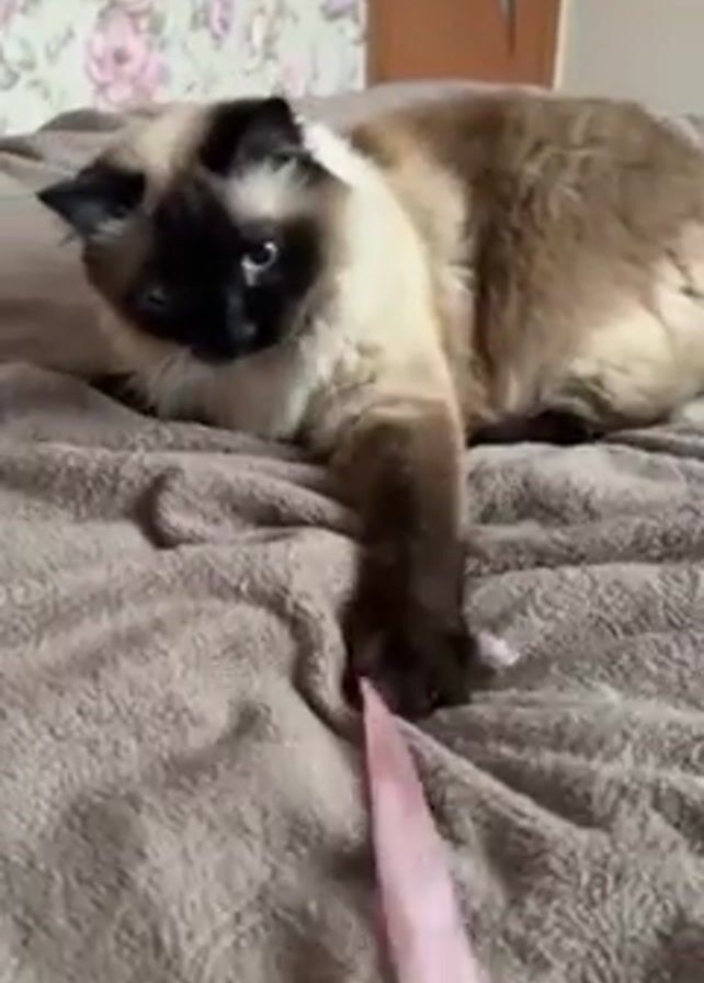 A cat, mostly cream-colored with brown points, is lying on a tan blanket on a bed. The cat extends a paw toward a pink ribbon lying in front of it. A person's hand enters the frame and grabs the ribbon next to the cat's paw. The background includes a floral wallpaper and a partially visible wooden door.