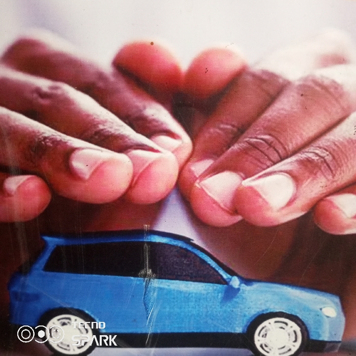 This image captures a close-up scene depicting two human hands cupped over a miniature blue car against a light, undefined background. The hands, exhibiting a dark skin tone with visible fingernails, are positioned in the upper portion of the frame, slightly out of focus, with fingers curved to form a protective enclosure over the object below. The car, a small, blue model resembling an SUV or hatchback, features black windows and white wheels with visible spokes, and is in sharp focus in the lower frame. The static composition illustrates a protective or caring interaction towards the vehicle. Visible image artifacts include faint horizontal and vertical lines, minor reddish specks, and a "TECNO SPARK" watermark in the lower-left corner. This scene is situated in the city of Ikeja, Nigeria.