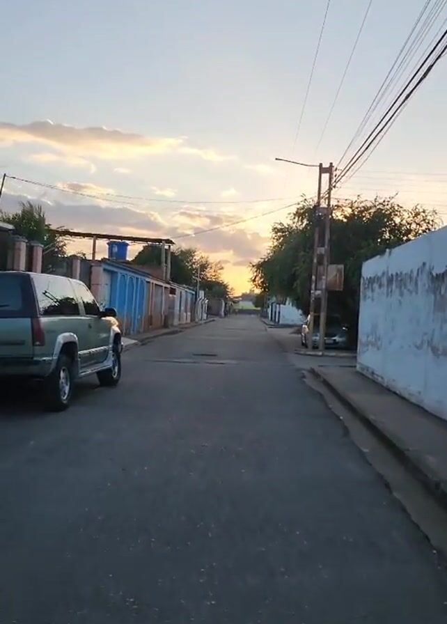 The video captures a still shot of a quiet street at dawn or dusk. An olive-green SUV is parked on the left side of the asphalt road. Rows of houses with colorful, often peeling, exteriors line the street on both sides. An electricity pole with multiple wires stretches across the sky. The sky is a blend of pale blue and light orange, indicating either sunrise or sunset.