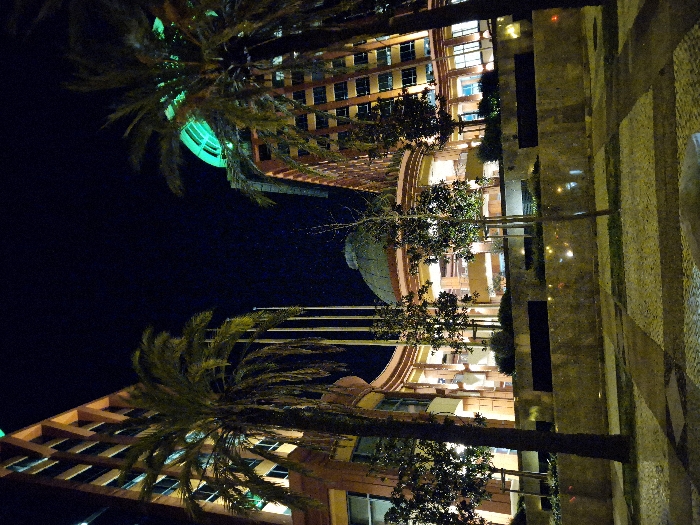 The image presents a nighttime street-level view of an urban environment in Parque das Nações, Lisbon, Portugal. Two modern, multi-story buildings with reddish-brown facades and numerous illuminated windows flank a central, lower structure with a prominent green-domed roof. The building on the left exhibits angular architectural elements in its upper section. The building on the right features a distinct green-lit curved structure at its apex. Two large palm trees are positioned in the foreground, one on the left partially obscuring the leftmost building and another on the right. In the mid-ground, a series of at least four bare flagpoles stand between the left building and the central domed structure. The foreground pavement consists of light-colored cobblestones arranged in geometric patterns, interspersed with darker rectangular sections. A low, light-colored stone wall or planter box separates the foreground from a raised landscaped area containing smaller trees and shrubs, some appearing deciduous. The scene is illuminated by artificial light from building interiors and street-level fixtures, casting light on the pavement and vegetation against a dark night sky. No individuals, vehicles, or specific actions are visible within the frame.