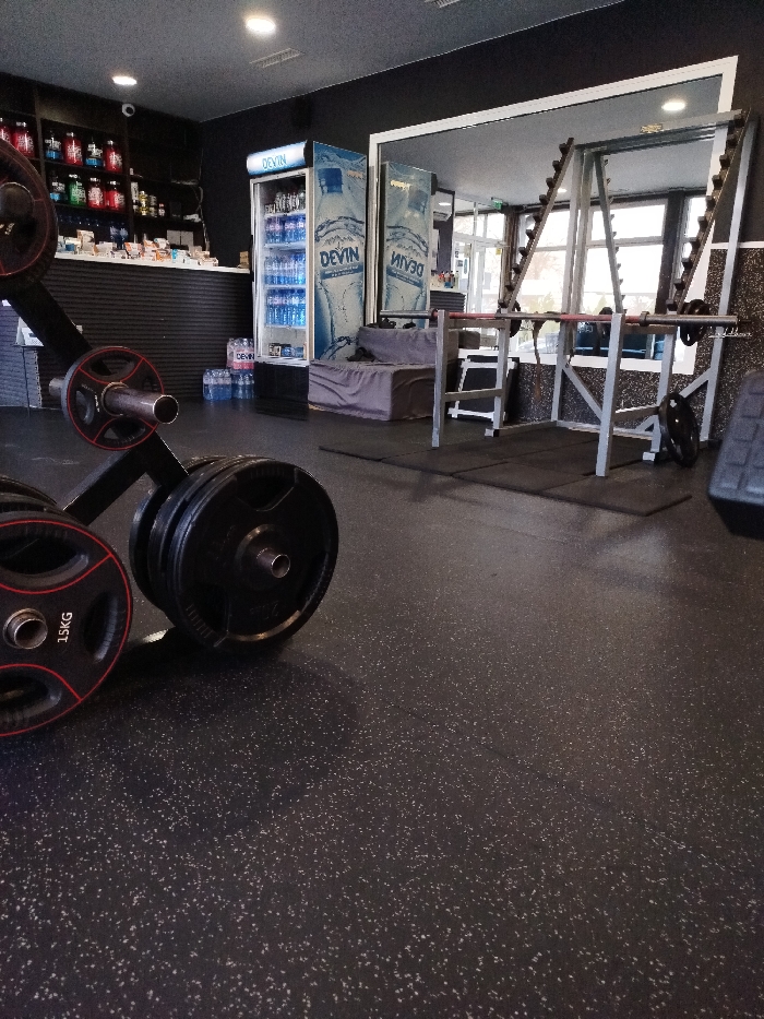 The image displays the interior of a fitness center in Plovdiv, Bulgaria