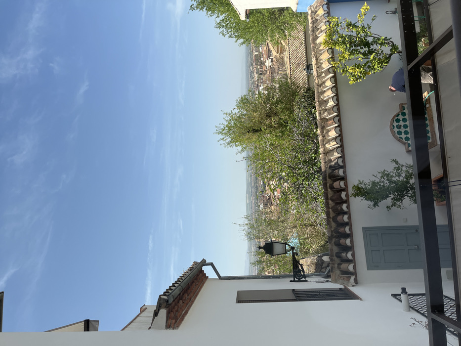 view from a patio in Granada, Spain (37.183, -3.598). The patio is surrounded by white walls and a tiled roof. A small tree grows in a planter in the foreground, and another tree grows to the right of the patio. In the background, the city of Granada is visible, with buildings and trees. There is a person in the lower right corner of the image watering a small plant. The sky is clear and blue with wispy white clouds. A black lamp post with a light fixture stands in the middle of the image, its shadow cast onto the wall. A small grey door is visible on the left wall, and a large window opens up to the view of the city. The overall image is of a peaceful and pleasant courtyard.