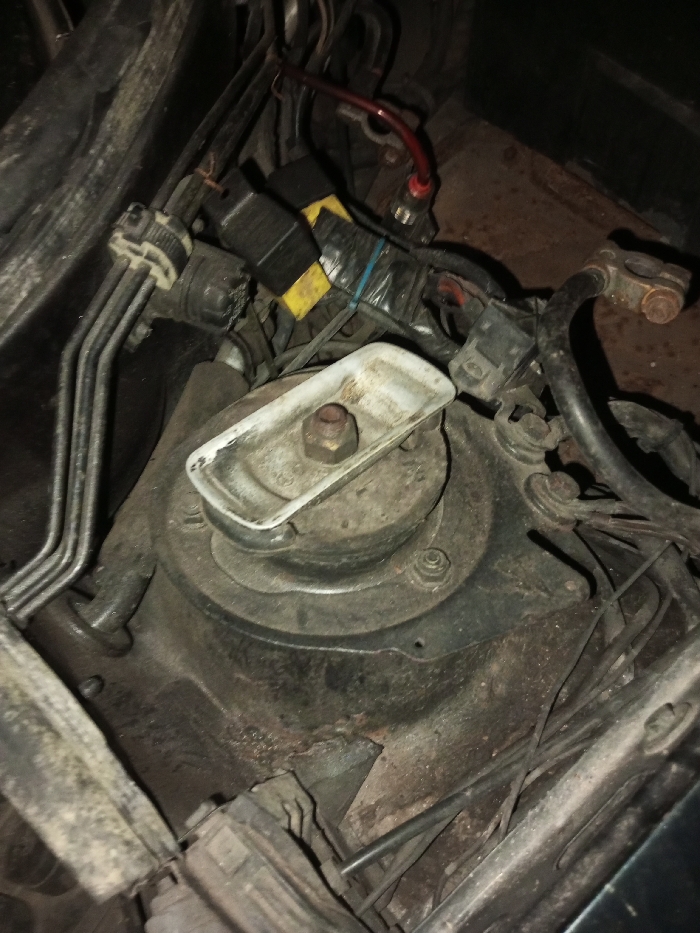 A close-up shows a car's engine bay, heavily soiled and showing wear. A prominent engine mount sits centrally, its metal bracket secured by a nut. Numerous wires, hoses, and electrical components weave around the mount. A red fluid line runs near a cluster of black and yellow-taped components. Rust is visible on various metallic surfaces.