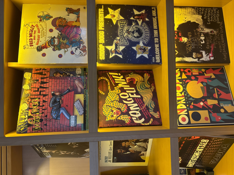 The image displays a multi-tiered shelving unit showcasing a collection of vinyl record albums within a record store or music shop in Yerevan, Armenia. Each compartment of the shelving unit is illuminated by warm yellow LED strips positioned along the top edges, highlighting the album covers. From top to bottom, left to right, visible albums include: 1. **Top Left:** A partially visible, dark-covered Miles Davis album. 2. **Top Middle:** Snoop Dogg's "Doggystyle" album, featuring a cartoon dog illustration, with an "ADVISORY" label and "Digitally Remastered" text. 3. **Top Right:** An album by Fred Wesley and The Horny Horns, with a yellow cover adorned with cartoon figures. 4. **Middle Left:** "Together" by Joe Williams & Harry Sweets Edison, displaying two men with musical instruments. 5. **Middle Middle:** "Congo Funk! Sound Madness From The Shores Of The Mighty Congo River," featuring a stylized leopard graphic. 6. **Middle Right:** "Snoop Dogg Presents: Doggystyle All-Stars Welcome to Tha House, Vol. 1," a blue-covered album with star motifs and images of artists. 7. **Bottom Left:** A partially visible album titled "Instrumentals Trauma," with glow-effect lettering. 8. **Bottom Middle:** "Onda Tropica," showcasing a colorful, abstract geometric design with musical instrument representations. 9. **Bottom Right:** An album by Robert Glasper and Miles Davis, featuring a dark, textured cover with prominent text. All albums are displayed upright, presenting their front covers, many appearing to be enclosed in protective plastic sleeves. The shelving material appears to be a light-toned wood or laminate.