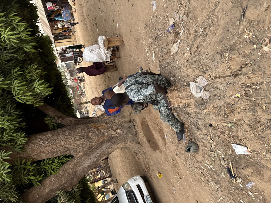 Outside, a man lies on a large tree trunk wearing a blue shirt with his face visible, and a patterned green suit and black shoes. A child stands beside him. Two men sit on stools near a building in the background. A white car is near the tree. The ground has scattered trash.