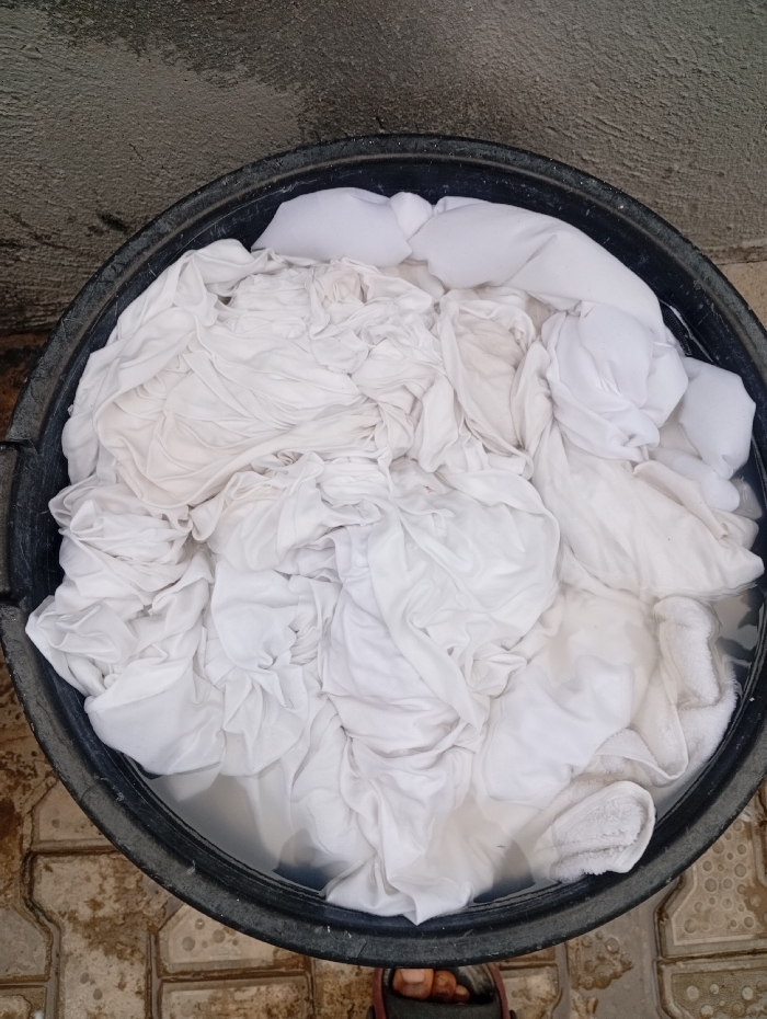 A black plastic tub overflows with white fabrics submerged in water. The cloths, crumpled and bunched together, appear to be soaking. The tub sits atop a tiled surface with a glimpse of footwear visible in the lower corner. A textured wall provides the backdrop. The scene conveys a sense of laundry in progress.