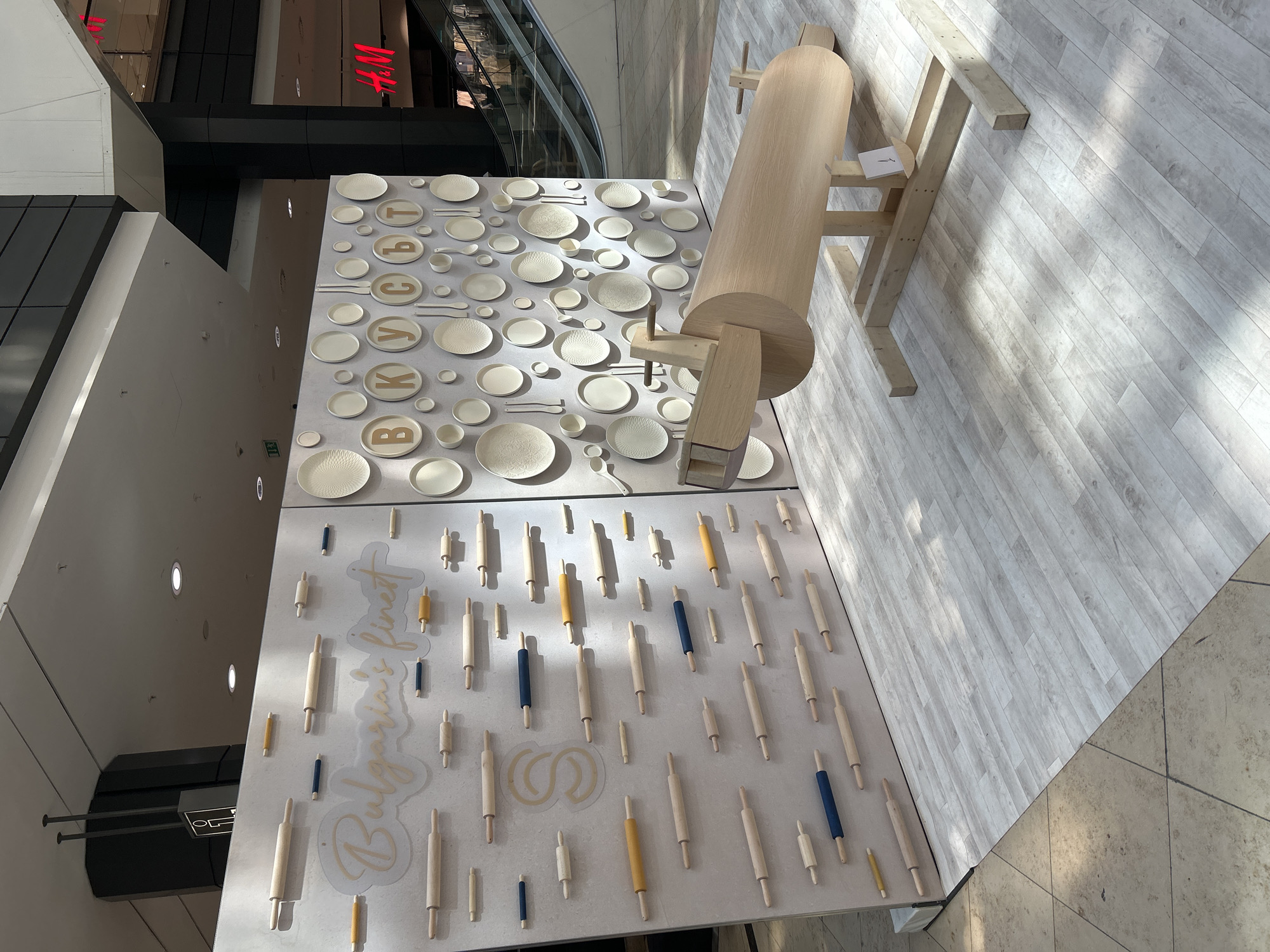 The image captures an artistic installation in a shopping mall, likely located in Sofia, Bulgaria. The scene is dominated by two white, rectangular platforms arranged in an L-shape, viewed from above and slightly to the side. On the first platform, there's a decorative arrangement of white plates, bowls, cups, and cutlery, spelling out the word "ВКУСЪТ" in Cyrillic letters, using the plates themselves as individual characters. Adjacent to this platform, there stands a large wooden cylinder supported by a rudimentary wooden frame, possibly part of the exhibit. The second platform displays a decorative array of wooden rolling pins of various sizes. Some of the rolling pins feature colored handles in blue and yellow. A cursive text overlay reading "Bulgaria's finest" is superimposed on the platform. The setting appears to be a modern shopping mall, evidenced by the polished flooring and glimpses of shops and escalators in the background. The presence of the "H&M" sign confirms this. Natural light floods the scene. No people are visible in the immediate view.