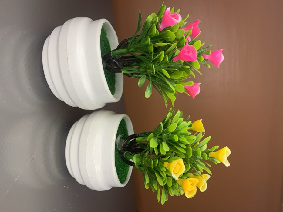 Two small potted plants sit side-by-side. Both have white, ridged pots filled with green plastic foliage. The top plant features bright pink, bell-shaped flowers. The lower plant mimics the upper one, but with vibrant yellow flowers. The background is split, showing a light gray surface beneath the plants and a brown, reflective surface behind them.