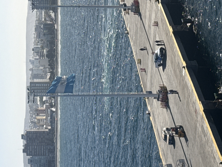 The image provides an elevated, oblique view of a concrete pier at the port of Municipio de Puerto Madryn, Argentina. The pier surface is grey, with a yellow-painted safety edge along its length. A tall white flagpole stands centrally, flying a wind-ruffled Argentinian flag, characterized by its blue and white horizontal stripes. On the pier, approximately ten individuals are observed: three stand near a white pickup truck with blue markings, one stands alone further down, and others are situated near a light-colored SUV/truck and a yellow forklift. Several clusters of red and white conical barriers are positioned on the pier, alongside dark mooring bollards and nested shopping carts near the left edge. The surrounding ocean water is dark blue, exhibiting surface chop and sparkling sun reflections, with a visible area of turbulent white water adjacent to the pier. The distant background reveals the city's skyline, comprising numerous multi-story buildings along a coastline, backed by distant hills under a clear, bright sky.