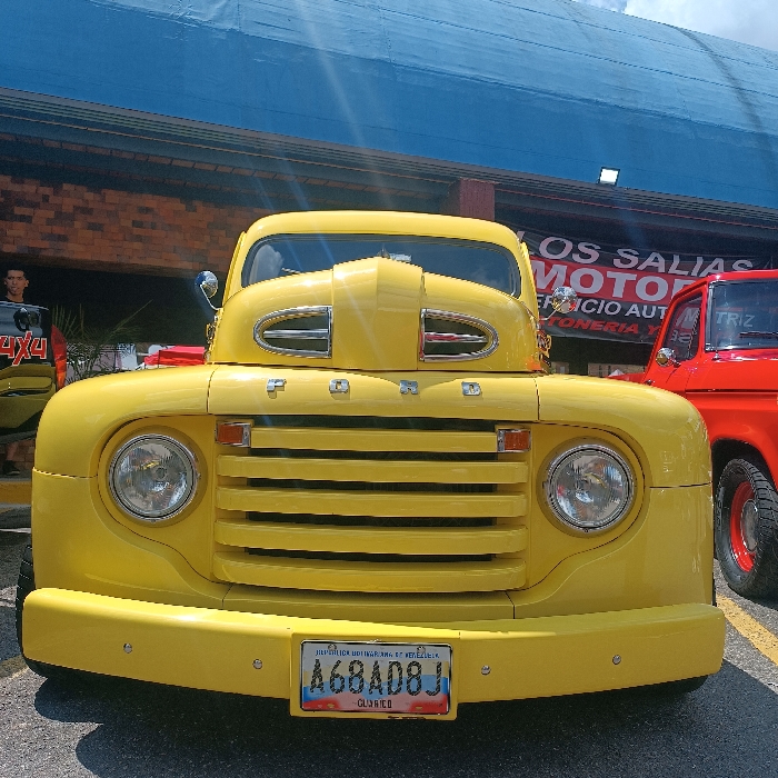 - "The image displays the front of a bright yellow, vintage Ford pickup truck parked outdoors in Carrizal, Venezuela, under daylight" by FM-mV6Ik2, licensed under CC BY 4.0