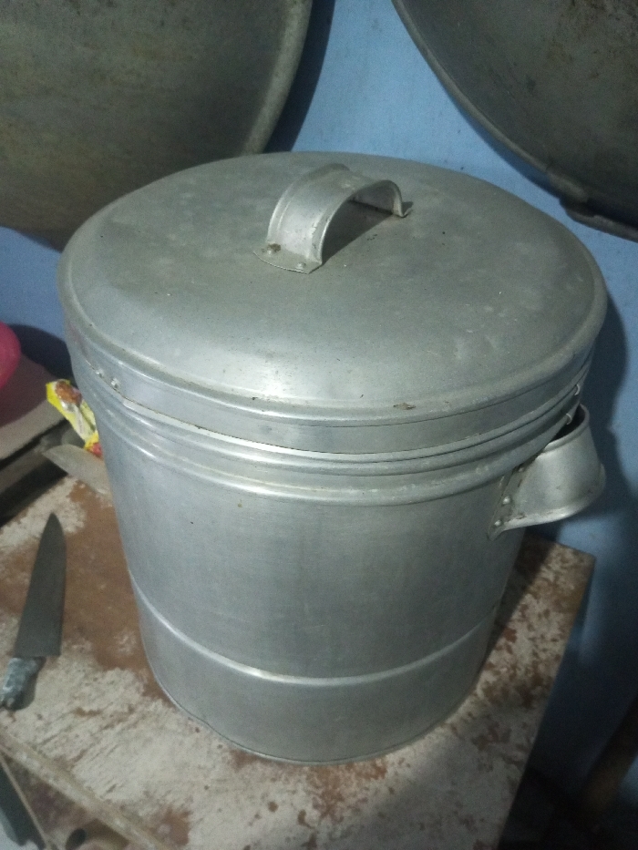- "The scene, located in Balapur, India, depicts a large, cylindrical aluminum cooking or storage vessel with a dull metallic sheen" by FM-HWMWB2, licensed under CC BY 4.0