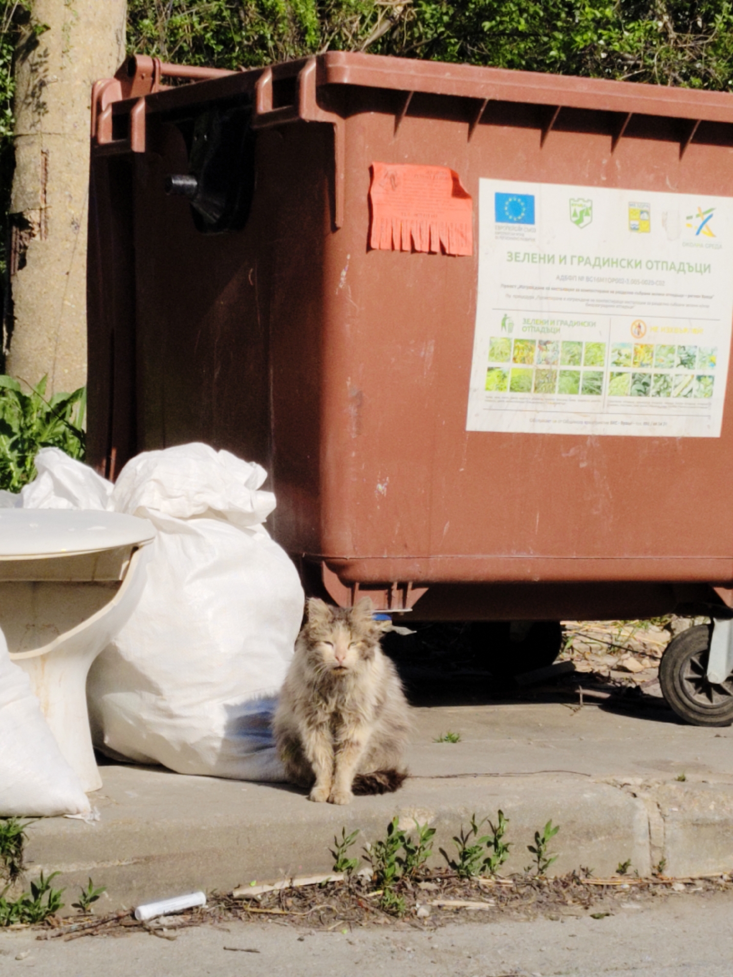 The image depicts a scraggly, light-gray cat sitting on the edge of a concrete curb near a large, brown, wheeled garbage container. The container has a partially torn orange fringe attached to it, as well as a large white rectangular sign with green text and symbols on it. Next to the cat, leaning against the curb, are two white plastic bags, one of which is behind a white plastic object that appears to be a broken toilet. A discarded cigarette butt lies on the ground in front of the cat. The scene takes place outdoors in daylight. The environment includes some small green plants growing along the curb and a tree trunk is visible in the background. The sign on the garbage container has symbols of the EU and the municipality of Vratsa. It also has the inscription "Зелени и градински отпадъци" in Bulgarian (Green and garden waste).