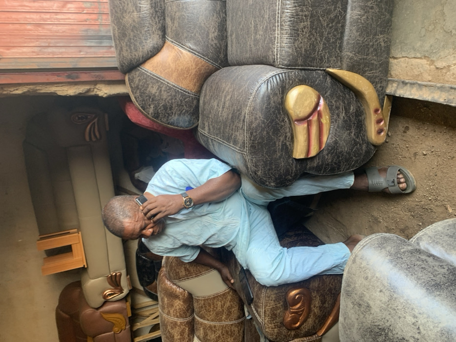 An adult male, appearing middle-aged, with short grey hair and stubble, is seated on a dark brown, textured, leather-look sofa within a furniture workshop or showroom in Jos, Nigeria