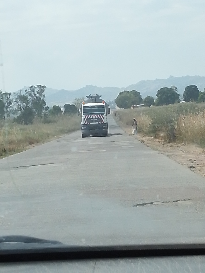 The scene, located in Kuru, Nigeria, depicts a paved road under a hazy sky with distant hills. A white MAN truck, possibly a specialized tanker or construction vehicle, featuring a prominent red and white chevron stripe pattern on its front, is proceeding on the road. On the right shoulder of the road, a solitary individual, dressed in light-colored clothing, stands. The road surface exhibits cracks and wear. Dry vegetation, including grass and trees, lines both sides of the road. A small, indistinct structure is visible in the mid-ground on the right. The image is captured from inside a vehicle.