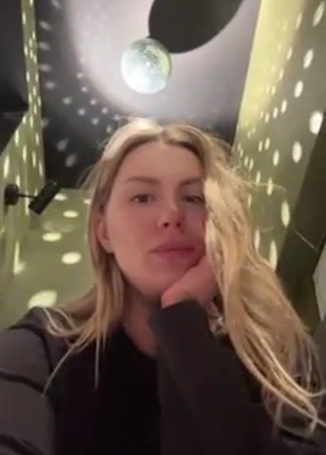 A young woman with blonde hair, wearing a black jacket, is sitting indoors with her chin resting on her hand. Behind her is a ceiling and wall illuminated with a patterned light, likely from a disco ball. The light creates multiple small, bright spots on the surfaces, giving the room a festive or entertainment-oriented ambiance. The woman is looking directly at the camera, slightly smiling at times.