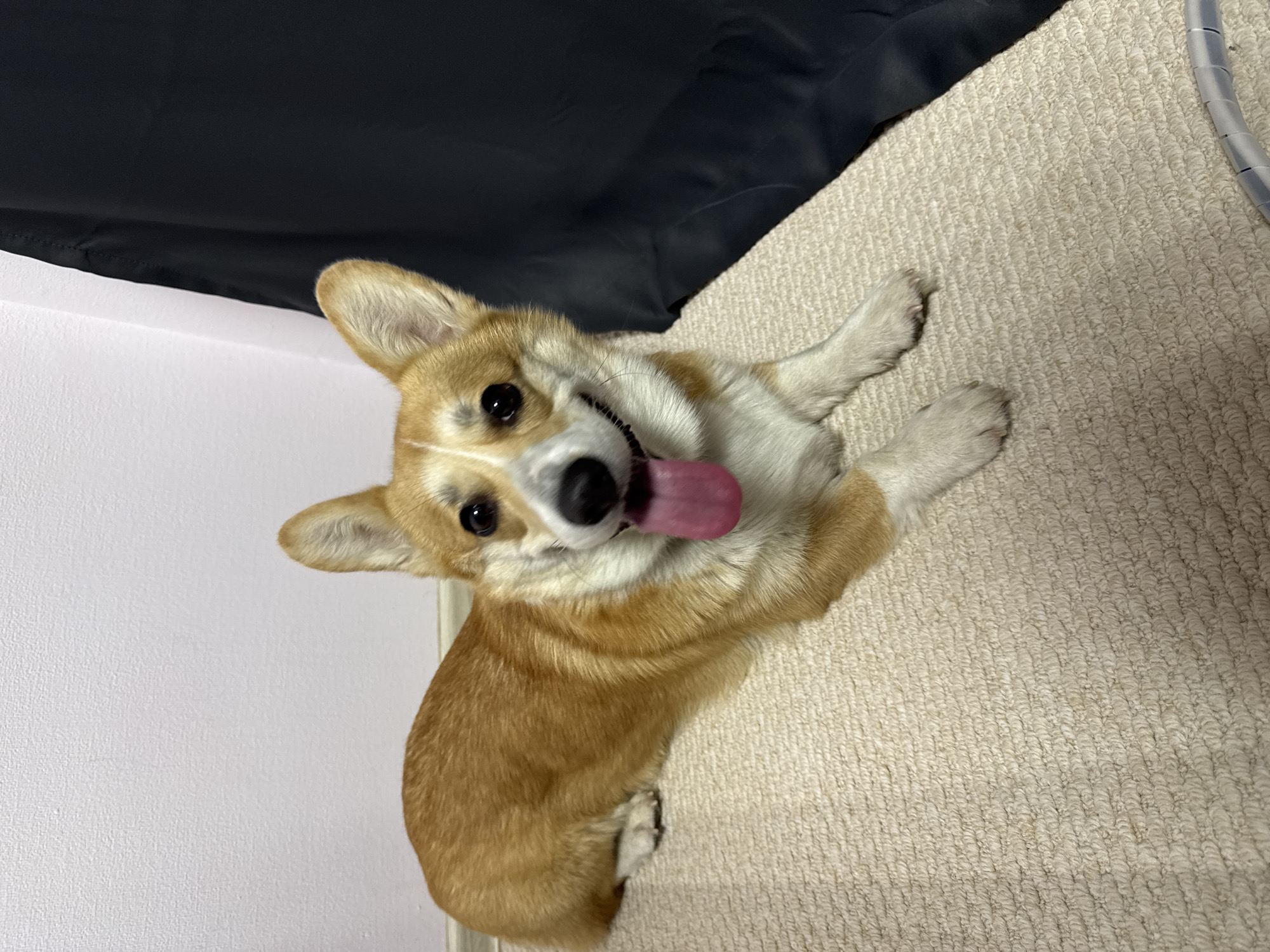 A medium-sized corgi with brown and white fur is lying on a beige carpet. The dog's mouth is open, revealing its tongue. Behind the dog is a wall, partly obscured by a black cloth. To the right of the dog is a coiled plastic cable. The image gives no information about the location in Ovoshchnoy, Russia.