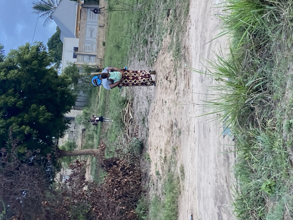 The image depicts an outdoor scene in what appears to be a semi-urban or rural area of Dar es-Salaam, Tanzania, under an overcast or twilight sky