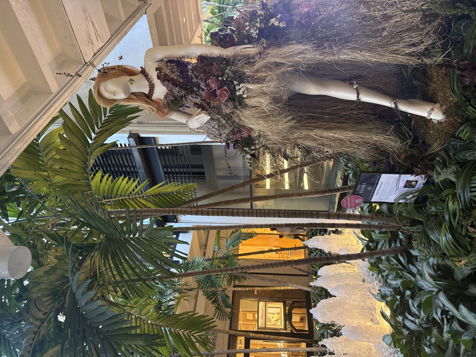 An outdoor commercial area in Bal Harbour Village, United States of America, features a life-sized female mannequin centrally positioned on a mossy, plant-covered base