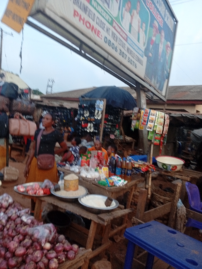 A bustling marketplace under a large advertisement for a school. Stalls display diverse goods: shoes, snacks, toiletries, and produce. A woman in a skirt is near onions and bowls of rice. Other people are visible in the background, indicating a lively commercial atmosphere. The market appears to be active, with various products available for sale.