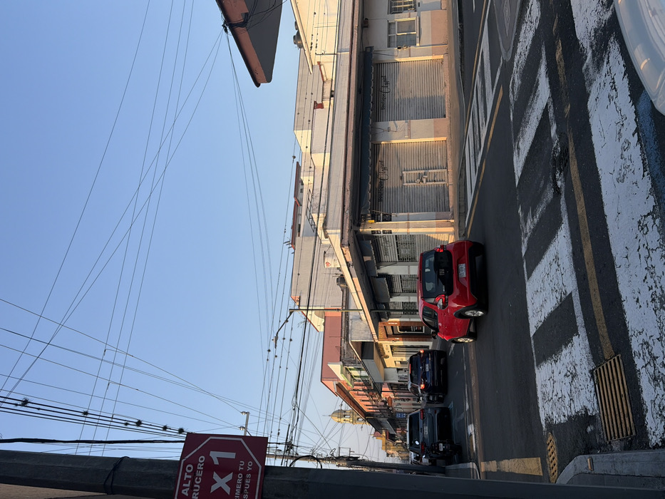 A street scene captures buildings with closed metal shutters, and a red car parked beside a crosswalk. Several cars follow down the road. Power lines crisscross the sky above. A stop sign reads "Alto Crucero X1" with further Spanish text. The perspective is skewed, as if viewed at an angle, and the sky is a clear blue.