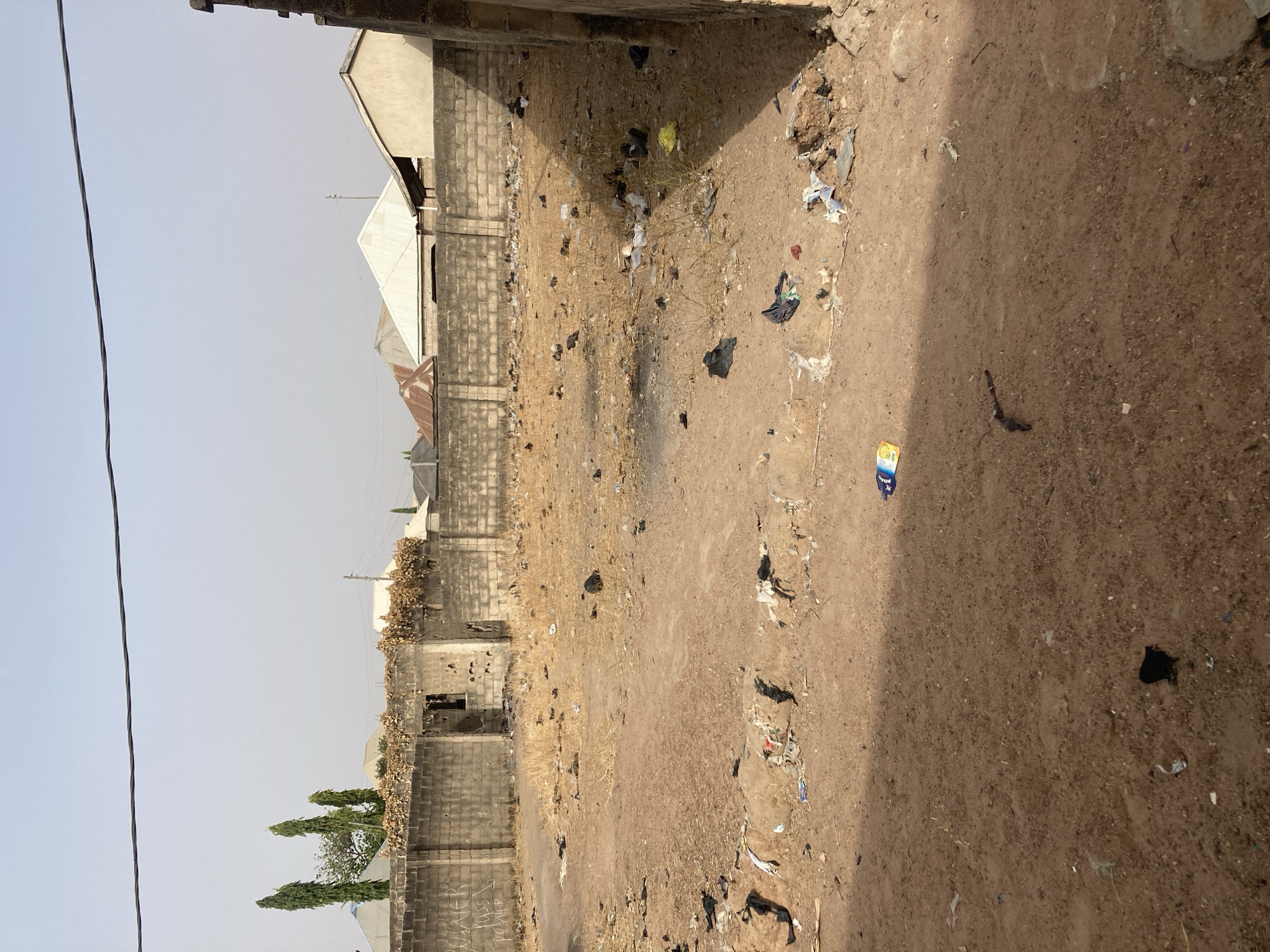 The image depicts a vacant lot in what appears to be a residential area in Minna, Nigeria. The ground is mostly dirt and is scattered with trash and debris. Along the left side of the lot are cinder block walls, indicating property boundaries or incomplete construction. Buildings with metal roofing can be seen beyond the walls. There are a few trees present. The sky is overcast. No people are visible.
