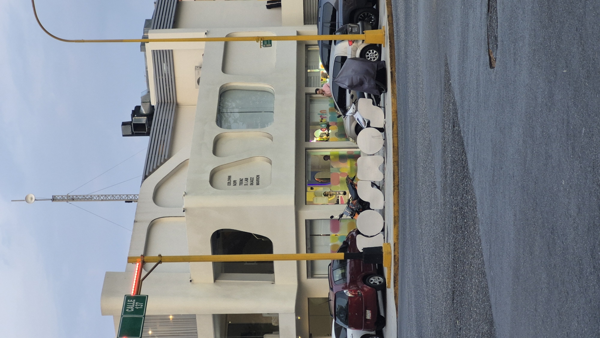 This image displays a street scene at Calle 137 in Valencia, Venezuela. A multi-story white building with an architectural design featuring irregular, rounded window cutouts and a flat roof forms the primary background structure. The ground-level storefronts display colorful, abstract window decals and the partial word "Colorin." A vertical text list on the building's facade above the ground floor reads "COLORIN," "NORI," "TEENZ," "D. LAB," "SKAIZZ," and "MARRON." On the rooftop, a lattice communication tower with a dish antenna and industrial ventilation components are visible against a light blue, cloudy sky. A prominent yellow pole in the mid-ground supports a green street sign clearly indicating "CALLE 137" and a horizontal red LED light strip below it. On the sidewalk or curb area, a series of large, white, abstract, rounded letter-form sculptures spell out "TOON COLORIN." Parked vehicles include a red hatchback, a silver hatchback, and a dark SUV. Two motorcycles are also present, one black and uncovered, the other draped in a dark grey tarp. Inside the ground-floor establishment, two individuals are partially visible through the glass; one person is wearing a light pink shirt and stands near the window. The asphalt road surface occupies the lower foreground, with a distinct yellow-painted curb line. A curved yellow streetlight pole is visible in the upper right.