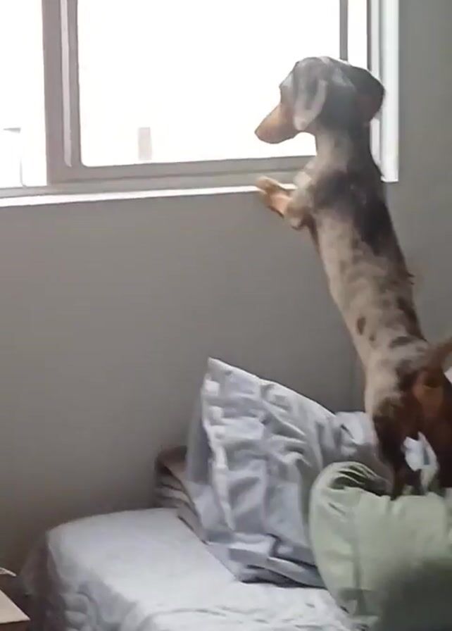 A brown and grey dapple Dachshund stands on a bed, paws pressed against a windowsill, barking out the window