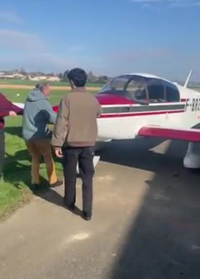 Three men push a small single-engine airplane from a paved surface onto grass. The plane is white with red markings, and the registration number F-BRZQ is visible on the tail. The men are dressed in casual clothing. The sky is blue with some clouds. The background includes a green field and some buildings in the distance. One of the men mentions sending the video to his mother.