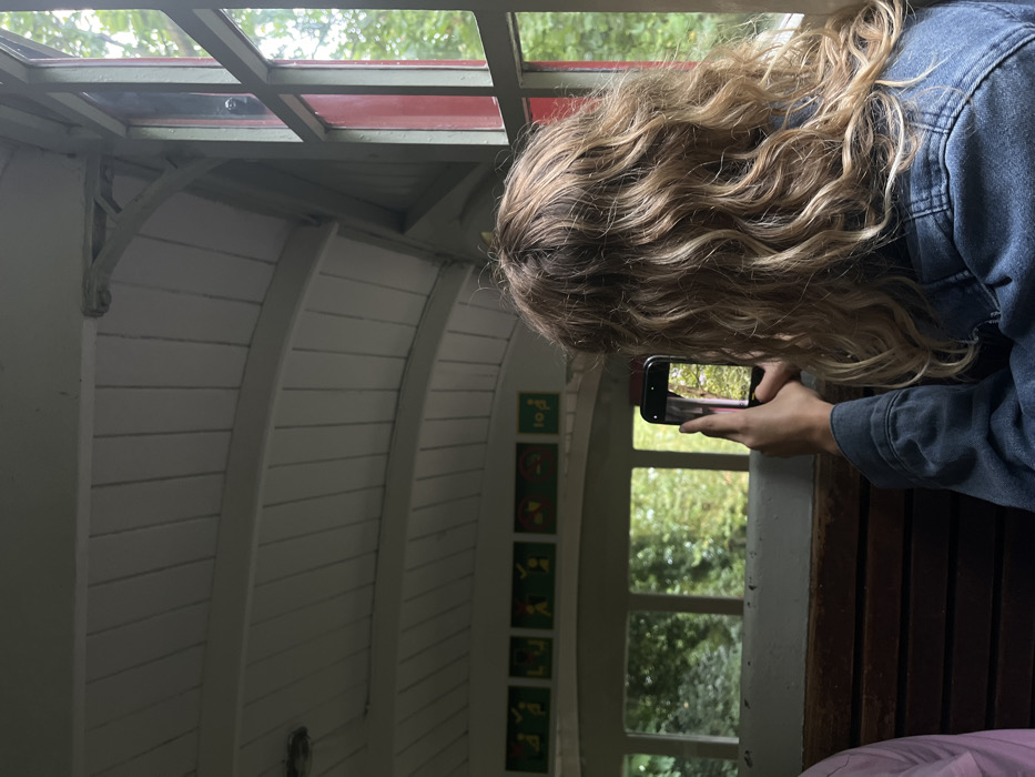 The image displays the interior of a train carriage, identified as being within the Monte Igueldo Amusement Park in San Sebastián, Spain. A person with wavy, light brown hair, wearing a blue denim jacket, is seated in the foreground, viewed from behind. This individual holds a black smartphone horizontally, its screen displaying a live feed of green foliage and trees outside the train, indicating an active capture of the view. The phone is positioned to record the external environment through an open window featuring red-framed panes on the right side. To the left, another open window reveals more green foliage outside. Above the windows, five rectangular signs are affixed to the upper wall; four of these signs depict stick figures illustrating various actions, and the fifth sign displays the text "10p". The carriage features a distinct curved, white slatted ceiling with a dark overhead light fixture and wooden slatted bench seating. A second person, wearing a light pink garment, is partially visible on the far left, seated on the same type of bench.