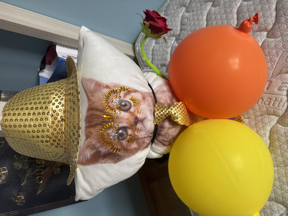 The scene depicts a decorative arrangement of objects indoors, in the city of Baiachevo, Bulgaria. In the foreground, a yellow and an orange inflated balloon rest on a light-colored quilted surface. Directly behind these, a white pillow or stuffed figure featuring a printed image of a kitten's face is centrally positioned. The kitten's eyes are embellished with gold and silver-toned adhesive rhinestones arranged to form decorative eyelashes. A golden sequined hat is placed atop the figure, and a matching golden sequined bow tie is fastened around its neck, visible over a black cord. To the right of the figure, an artificial red rose with a green stem is present. The background includes a dark book with gold lettering on the upper left, a light blue wall, and a light-colored wooden structure on the upper right. A white and blue object is partially visible behind the figure on the right. No individuals are present.