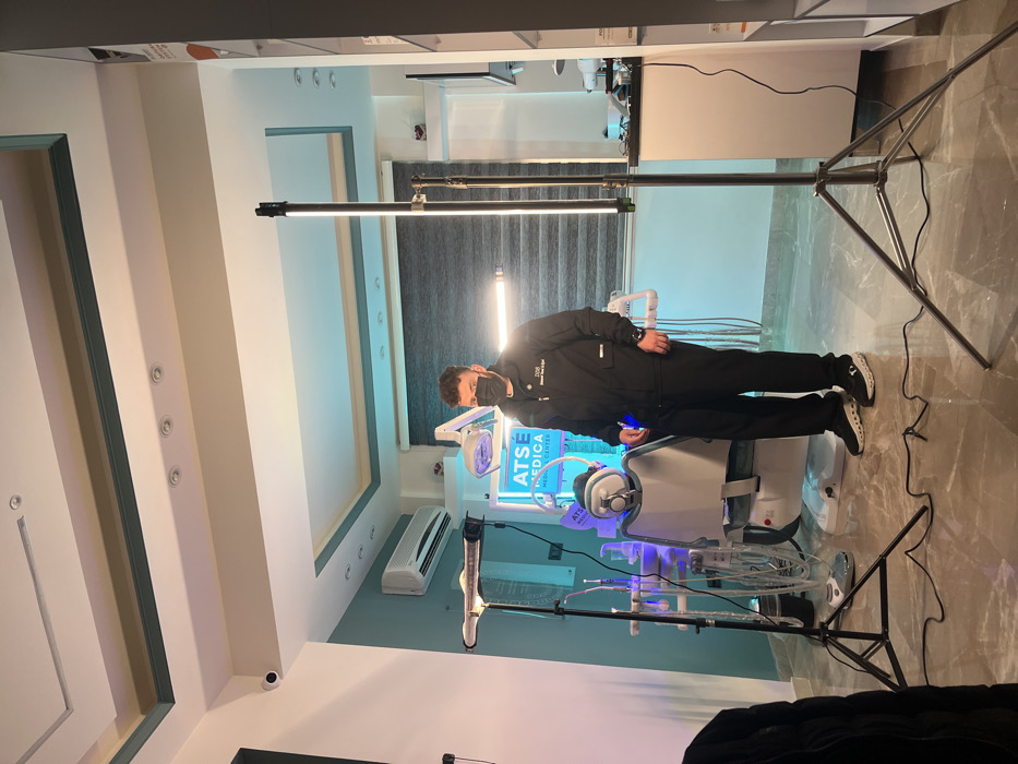 An indoor scene within what appears to be a dental or medical clinic located in Al-Qanawat Municipality, Syria, is depicted. The room features light teal-colored walls on the lower half and white walls on the upper half, with a multi-tiered false ceiling incorporating recessed lighting and a perimeter strip light. A white security camera is mounted in the upper left corner of the ceiling. The floor is covered with light-colored, marble-patterned tiles. In the center-right of the frame stands a single adult male, facing slightly towards the camera. He is wearing a black long-sleeved jacket with a white logo, "DDR Dental Trust & Care," visible on the left chest, black trousers, and black and white athletic shoes. A black protective face mask covers his nose and mouth, and he has short, dark, curly hair and a beard. Behind the man and to his left is a modern white and gray dental chair equipped with an articulating arm holding a dental examination light and various hoses and instruments. Directly behind the dental chair is a tall, illuminated vertical display unit featuring blue text that reads "ATSE MEDICA MEDICAL CENTER." An air conditioning unit is visible on the wall above and to the left of the dental chair. A window with dark gray horizontal blinds is visible in the background. Two professional studio light stands, each holding a vertical LED light strip, are positioned in the foreground and midground. One stand is on the left, near the dental chair, while the other is on the right. Black electrical cables from these lights are visible on the floor. A white medical cabinet or shelving unit is partially visible on the far right of the image. No direct actions or interactions are occurring; the man appears to be posing for a photograph or video.