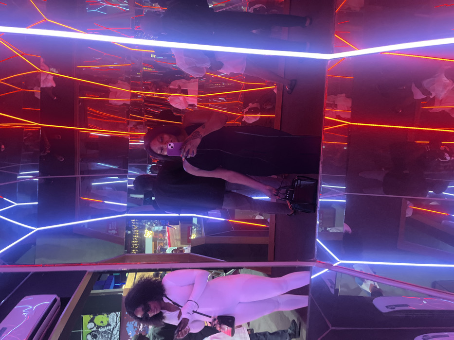 A woman with dark hair is taking a selfie in a mirror room with neon lights. She's wearing a black dress and holding a purple phone. Reflected multiple times, she and others in the room are seen. Red and blue neon lines create a geometric pattern on the walls and ceiling. Another woman wearing a white outfit is also reflected, further enhancing the illusion of depth and repetition.