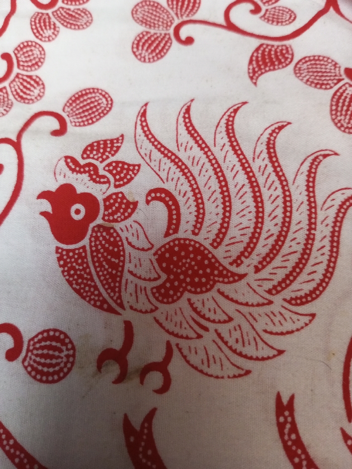 A white fabric features a repeated pattern in red. Stylized flowers with dotted centers and curved vines are scattered across the surface. A central motif depicts a rooster or similar bird with a prominent crest, detailed feathers filled with dots, and small feet. The design style is reminiscent of a hand-printed or batik technique. Minor stains are visible on the fabric near one of the floral patterns.