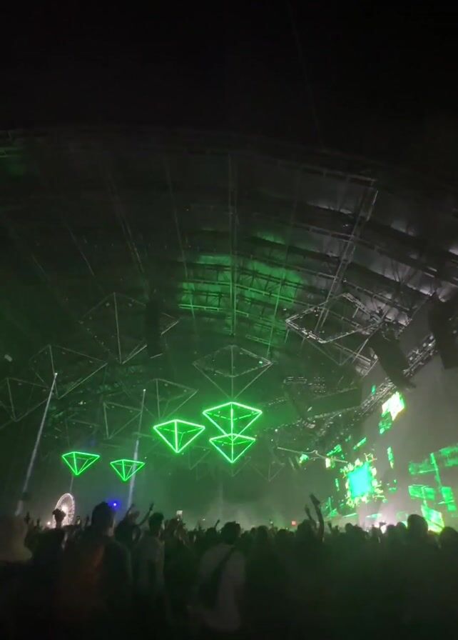 large crowd of people at what appears to be a music festival or concert. The setting is dark, with the stage displaying green lighting and geometric shapes. Similar green geometric shapes are suspended from the ceiling, enhancing the visual display. The crowd is facing the stage, with many individuals raising their hands in the air, indicating enjoyment of the performance. Smoke or fog is present, likely contributing to the atmosphere of the event. The architecture includes a high, arched ceiling supported by a visible metal framework. Overall, the scene captures the energy and atmosphere of a live music performance.