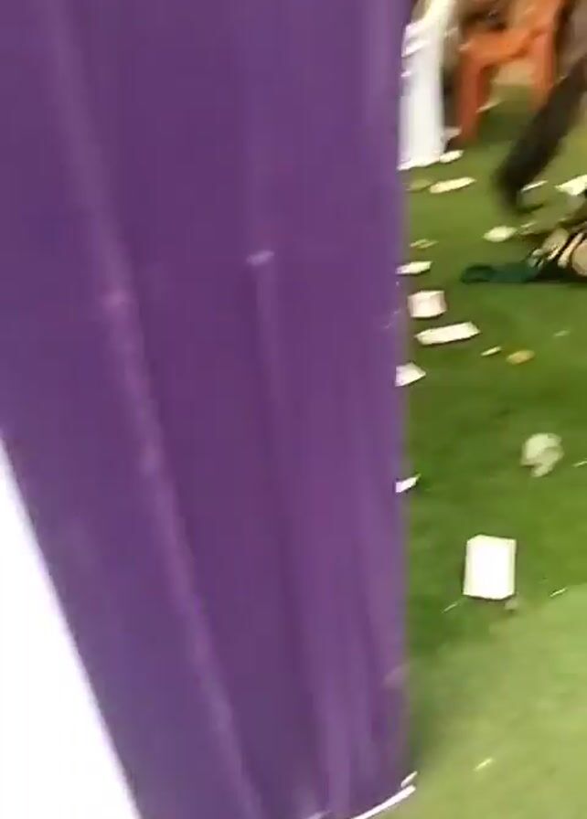 A woman in a green, black and gold dress is dancing on a green surface covered with paper money, surrounded by people watching and recording the scene. Some people are sitting in chairs, while others are standing. The scene is outdoors under a tent or canopy, with a tree visible in the background. The woman is throwing money into the air as she dances, smiling and clearly enjoying herself.