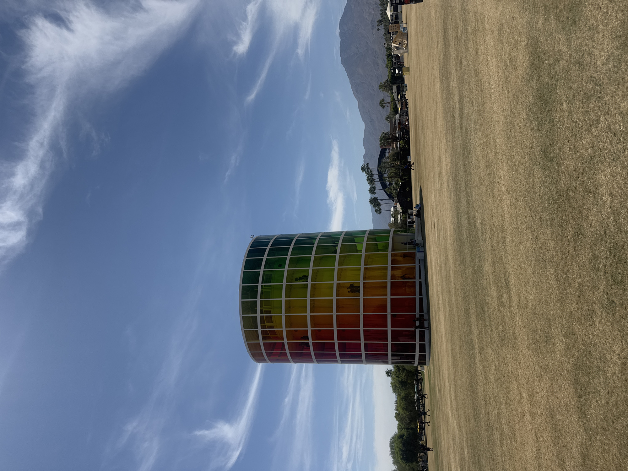 The image captures a cylindrical, multi-tiered, rainbow-colored structure in Indio, California, United States