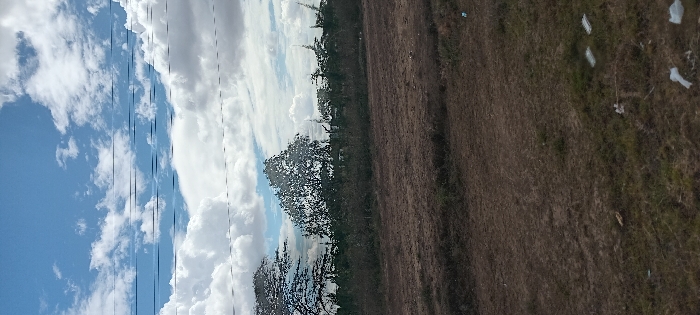 A field of dry, brown grass occupies the foreground, transitioning to a line of trees and foliage. Above, a sky filled with fluffy white clouds against a blue background is visible. Power lines stretch across the sky, creating a visual layer between the atmospheric scene and the landscape. The composition is rotated, with the sky appearing on the left and the field on the right.