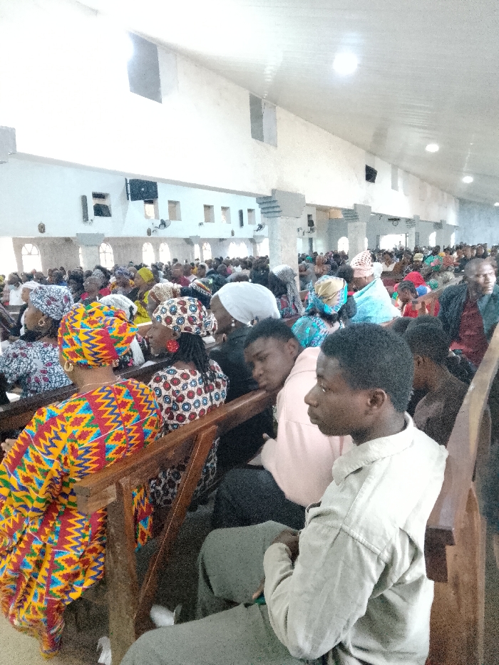A crowded church scene shows rows of people seated in pews. Many individuals are wearing colorful head coverings and traditional attire. A young man in a light-colored shirt sits in the foreground, gazing to the right. The interior of the church is bright, with white walls, pillars, and high ceilings. Several windows and a speaker system are visible in the background.