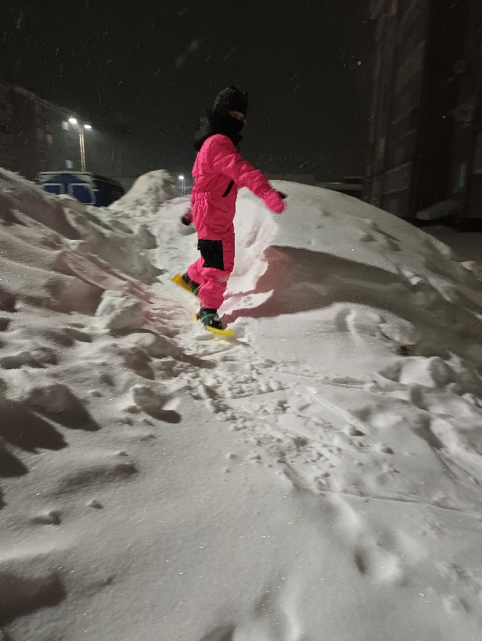 A child wearing a pink snowsuit and dark hat walks on snow-covered ground at night. The child wears yellow snowshoes and black accents adorn the snowsuit. Deep snowdrifts dominate the foreground and background. A building stands to the right. Streetlights and another building appear faintly in the distance, while snow falls softly.