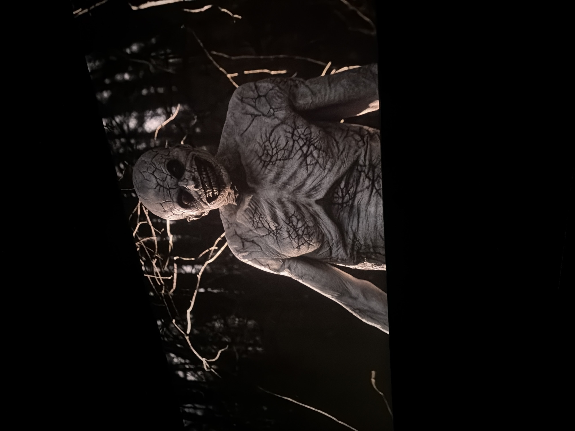 The image depicts a menacing, humanoid figure with a skeletal face and cracked skin, resembling a monster or creature, possibly a prop or mannequin