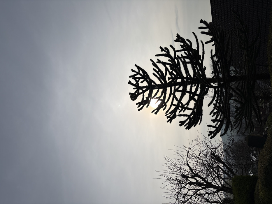 The image depicts an outdoor scene in Snailbeach, United Kingdom, characterized by strong backlighting during daytime. A prominent Monkey Puzzle tree (Araucaria araucana) stands silhouetted in the center-right foreground, its dark, spiky branches extending upwards and outwards. The sun is partially obscured behind the upper right portion of this tree, emitting a bright, diffuse glow through a light gray, hazy sky. To the left of the Monkey Puzzle tree, a bare deciduous tree with fine branches is also silhouetted. Below these trees, dark vegetation and the dark-tiled roofline of a building are visible in the lower right and center-left, respectively. Distant, indistinct hills are faintly discernible on the horizon beneath the hazy sky. No people, discernible actions, or interactions are present.