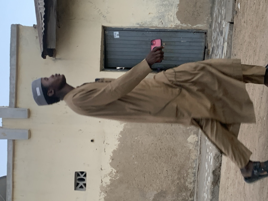 A male individual is depicted walking from left to right on an unpaved surface in Gwagwarwa, Nigeria