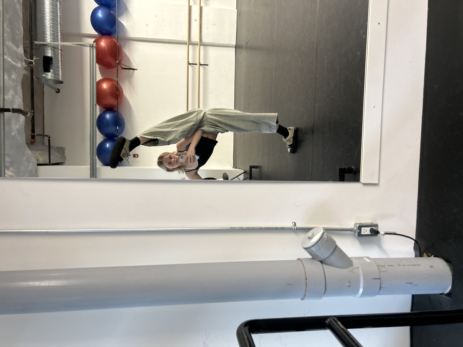A young woman in a black top and gray pants performs a split while holding a phone in front of a large mirror in a studio