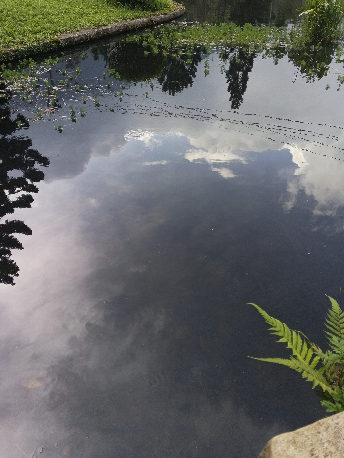 This image depicts a still body of water, possibly a pond or canal, located in Stueng Saen, Cambodia. The dark water surface reflects an overcast or partly cloudy sky, showing patches of white clouds and gray sky. Silhouettes of tall trees, including one resembling a conifer, are also reflected from the left and upper areas of the water. In the upper-left quadrant, the water meets a clearly defined bank composed of bright green grass, separated from the water by a low concrete or stone retaining wall. Scattered across the water's surface, particularly in the upper half, are clusters of green aquatic plants. Linear patterns, consistent with floating debris or small organisms, are visible across the middle-upper water surface. A small set of concentric ripples is present in the upper-middle-left portion of the water, indicating a recent disturbance. In the bottom-right corner, a large, light-colored, textured stone structure forms part of the bank. From this structure, vibrant green fern fronds extend over the water. No individuals, animals, or specific human activities are observable within the frame.