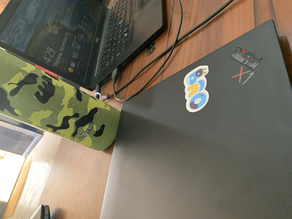 The scene depicts a desk in an indoor setting in Jos, Nigeria. In the foreground, a closed black ThinkPad X1 Carbon laptop is positioned on a wooden surface, featuring a colorful "OYIBO" sticker and a prominent "X1 Carbon" logo with a red dot. To the right and slightly behind the ThinkPad, a green, black, and light green camouflage-patterned water bottle, labeled "JANGNENG" and showing condensation droplets, stands upright. Further back and to the right, an open black Dell laptop is visible, with its screen displaying "4:29", "Thursday, November 20", and a weather icon indicating "30°C". Dark charging cables are connected to the Dell laptop and rest on the wooden desk surface. A blurred, light-colored doorway or window is visible in the background, suggesting ambient light. No individuals or active interactions are observed.