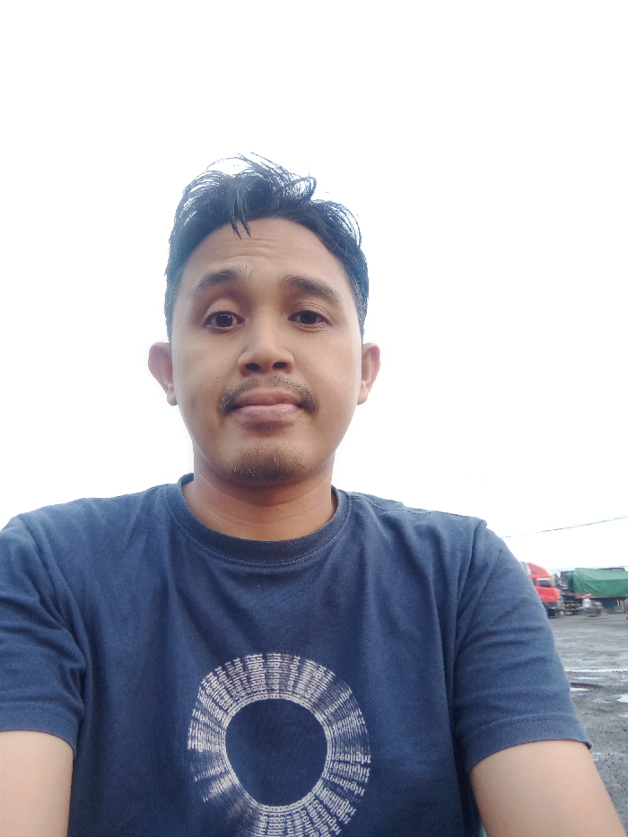 A medium shot shows a man with tan skin, dark hair, and a mustache. He wears a dark blue t-shirt with a white circular design. The background is mostly white sky. Part of a red semi-truck with a green tarp is visible in the lower right corner. The scene appears to be outdoors, possibly a truck stop.