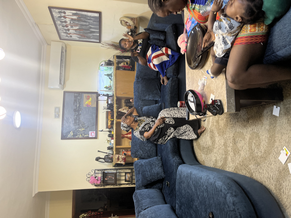 A family gathers in a living room. An infant rests on a woman's lap at a coffee table. Nearby, a child sits on the couch, gesturing. An older woman sits on the sectional sofa, hand on her forehead. Artwork adorns the walls, and a shelf filled with decorations and a fish tank is visible. The living room has carpet and a dark blue sectional sofa. A red drink can sits on the table. The photo appears to be taken indoors.